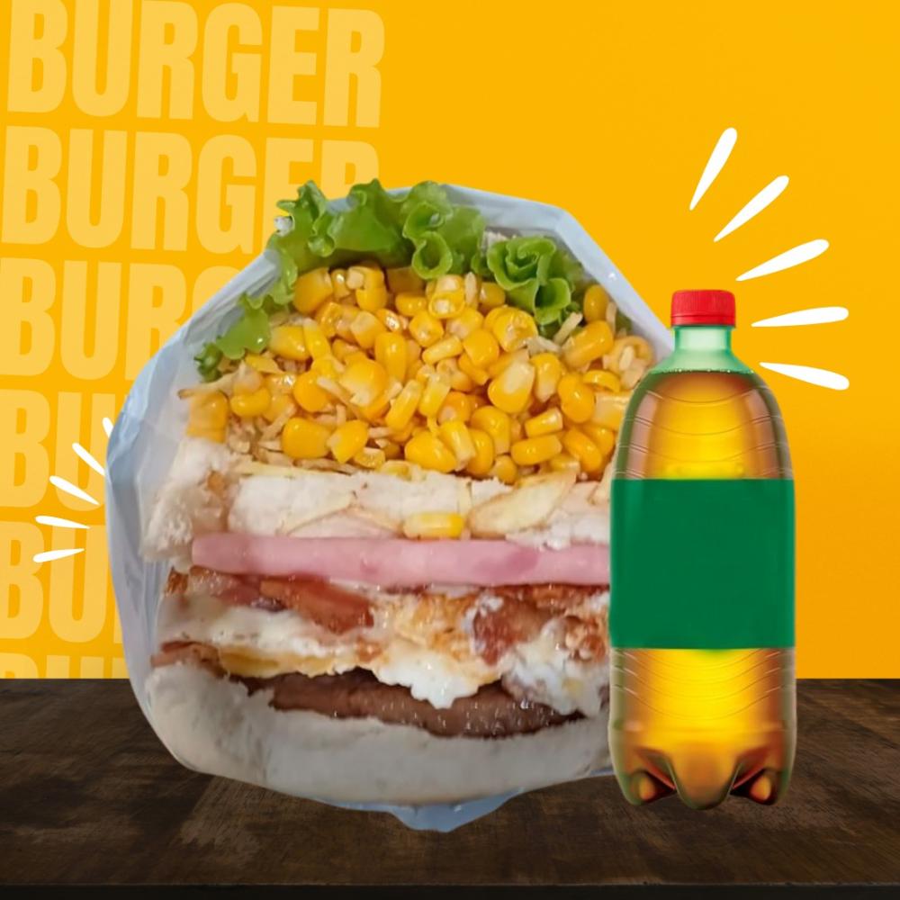 Pão, hambúrguer bovino 90gr, bacon, ovo, presunto, queijo, alface, tomate, batata palha e milho verde.
