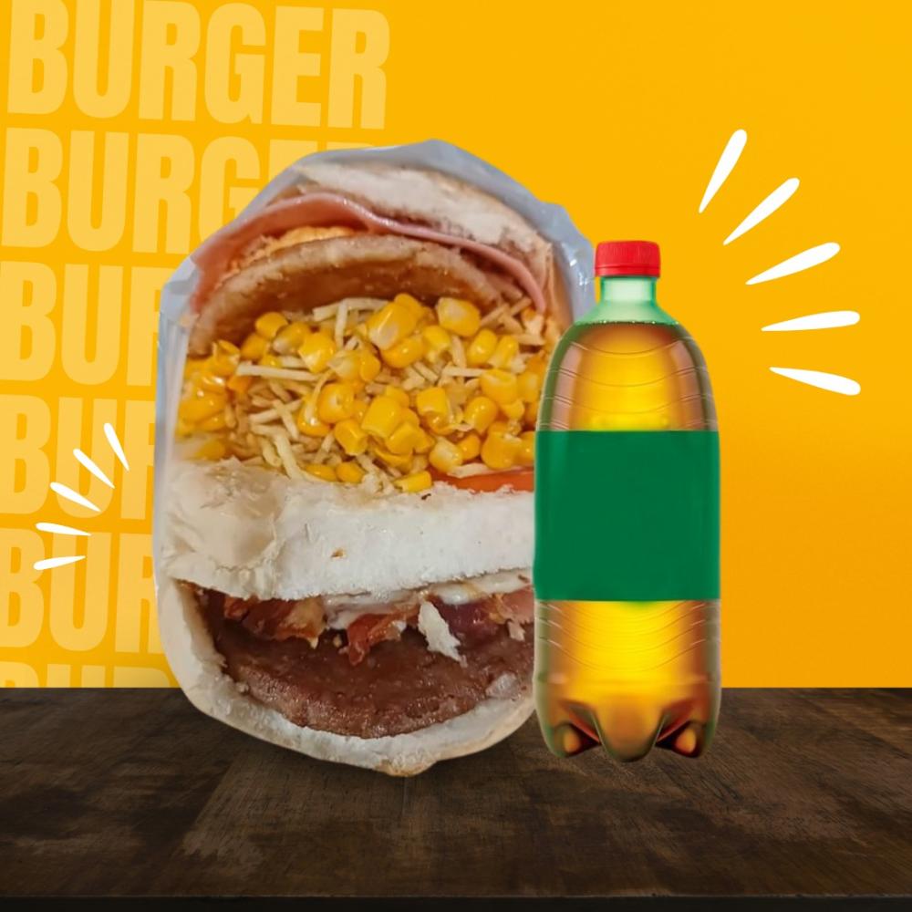 Pão, hambúrguer bovino 90gr, hambúrguer de frango 90gr, bacon, 2 ovos, presunto, queijo, tomate, batata palha e milho verde.