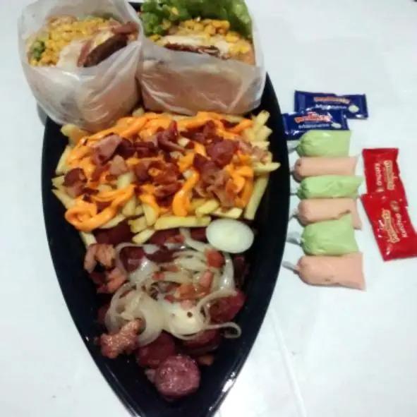 2 x-tudo +carne + 500g fritas c/bacon e queijo.