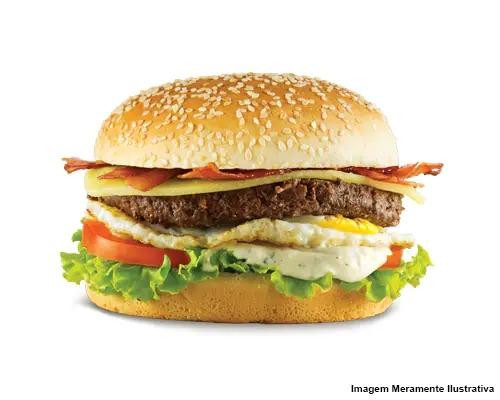 Pão, hambúrguer bovino 90gr, bacon, ovo, queijo, alface, tomate, batata palha e milho verde.