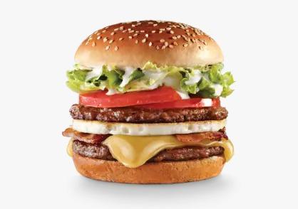 Pão, hambúrguer bovino 90gr, hambúrguer de frango 90gr, bacon, 2 ovos, presunto, queijo, tomate, batata palha e milho verde.