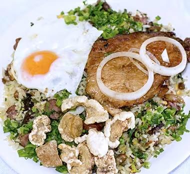 Lombo, bacon, torresmo, ovo, arroz, feijão e couve.